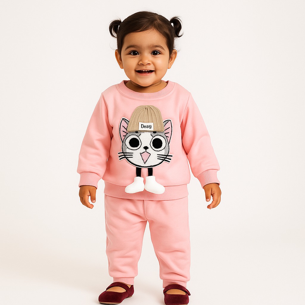 This adorable two-piece set features a soft, pastel pink Pre Winter set paired with matching jogger-style pants for a cozy and coordinated look. The sweatshirt stands out with a playful, oversized cat graphic on the front, complete with fun textured details—including a little 3D cap and dangling legs that add charm and personality. The relaxed fit and ribbed cuffs make the outfit comfortable for everyday wear. This look is sweet, cheerful, and perfect for playtime or casual outings.