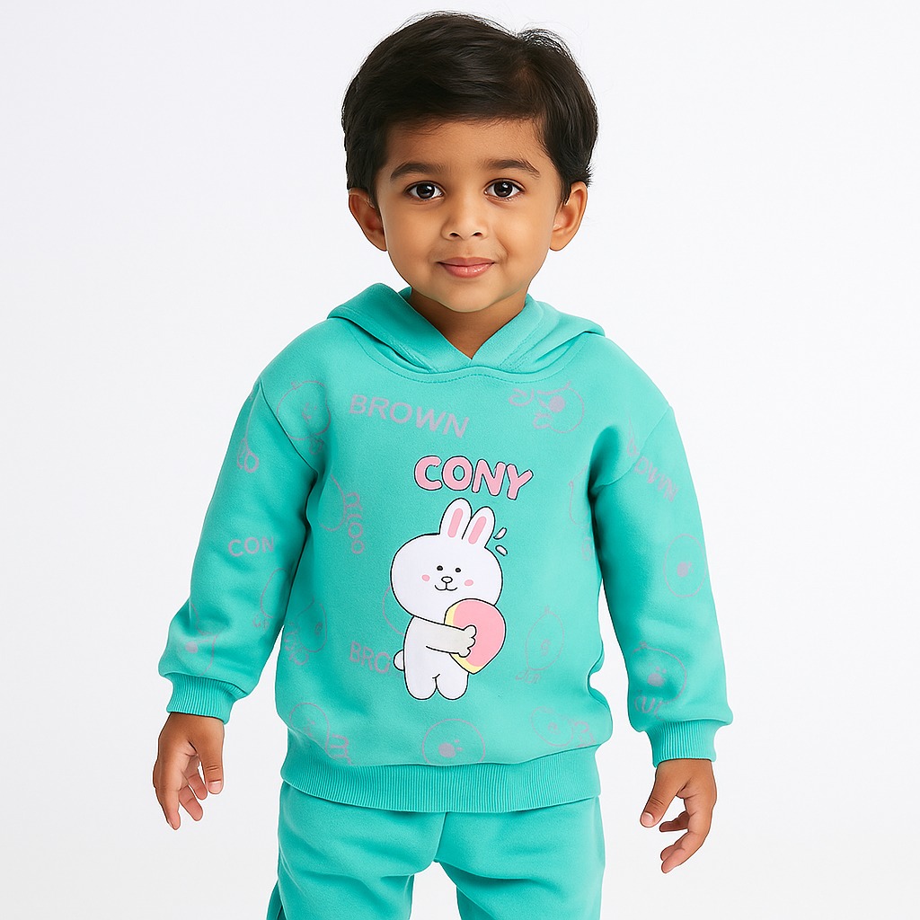 This is an adorable red two-piece toddler tracksuit featuring a fun cartoon theme. The hoodie has an animated bunny character along with playful text like “CONY” and “BROWN” scattered across the fabric.